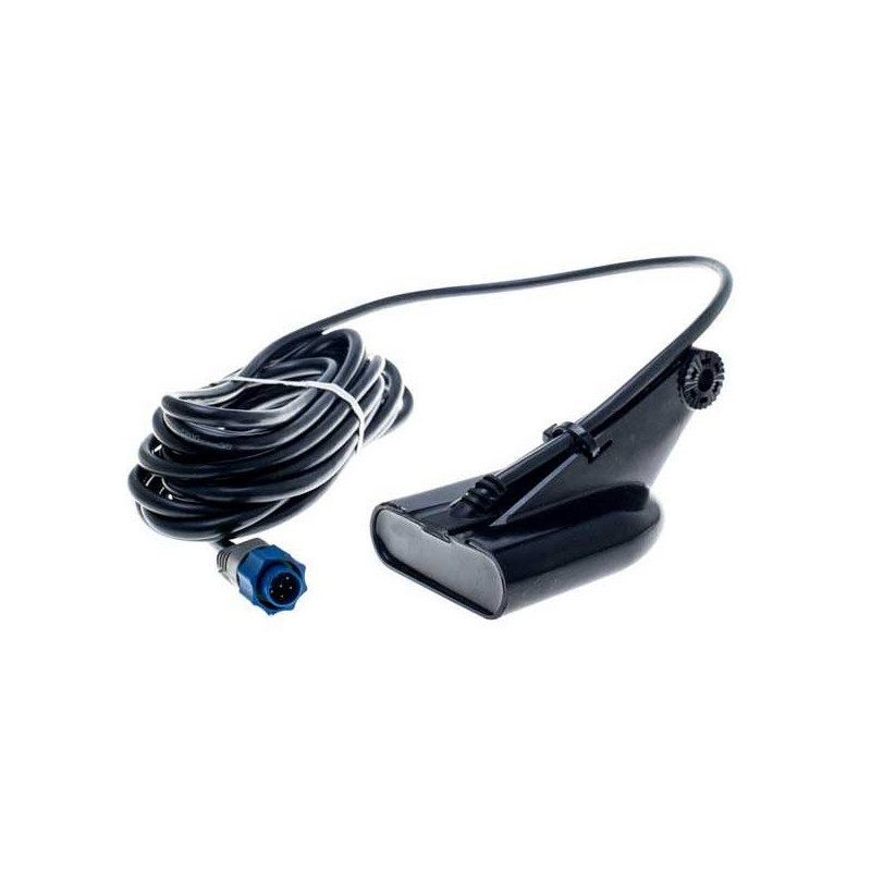 Con sensor de temperatura integrado. Incluye soporte y tornillería de montaje. Cable de 6 m (20 pies) de longitud. Cuerpo azul de marca Lowrance.