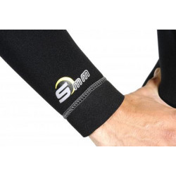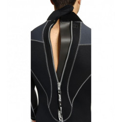 La manga larga de una pieza está hecha de neopreno de 5 mm con doble forro y tiene una fuerte cremallera trasera YKK con Aquastop debajo de la cremallera para minimizar las infiltraciones de agua.