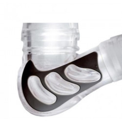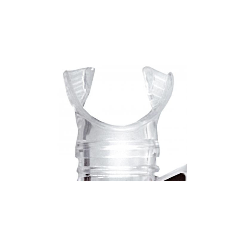 Boquilla anatómica en silicona muy flexible, transparente o dark, intercambiable con el regulador. Gran sección de la tobera de entrada del aire y tetones sobredimensionados de diseño ortodóncico.
