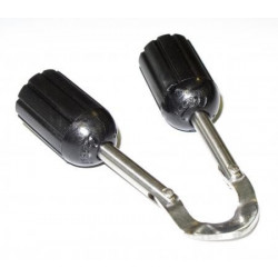 Obús articulado Francés. Es considerado el obús con enganche más seguro y fácil debido al díseño angulado del perfil de la platina. Varillas en acero inoxidable AISI 304 endurecido de Ø4 mm con bloqueo mediante arandela y tuerca autoblocante. Casquillos de gran calidad en Delrin con rosca calculada para que el roscado y desenroscado de las gomas puedan realizarse cómodamente con los dedos sin necesidad de herramientas.