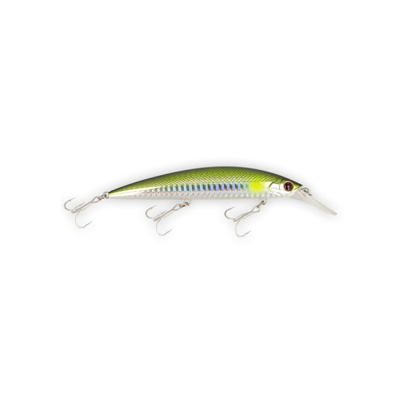 Jerkbait sinking de gran peso específico y babero potente. Perfecto para pescar desde las rocas con altura ya que su agarre al agua es muy fuerte