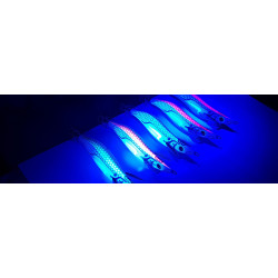 La etiqueta en la parte superior del producto es UV activa, aumenta la visibilidad del producto en la pesca diurna y la etiqueta especial en el costado del señuelo es de brillo azul.
