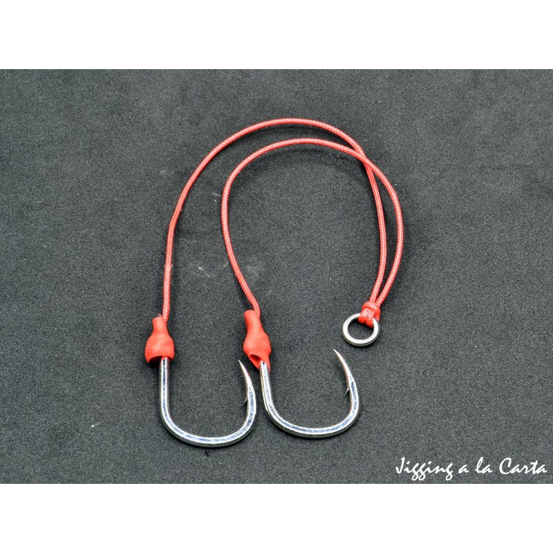 Montaje incluye; 1 montaje doble de anzuelos BKK 1/0 de carbono 3X (HIGH CARBON), empatillados cubiertos con termo-retráctil, trenzado reforzado de 1.2mm y anilla soldada de acero inoxidable.